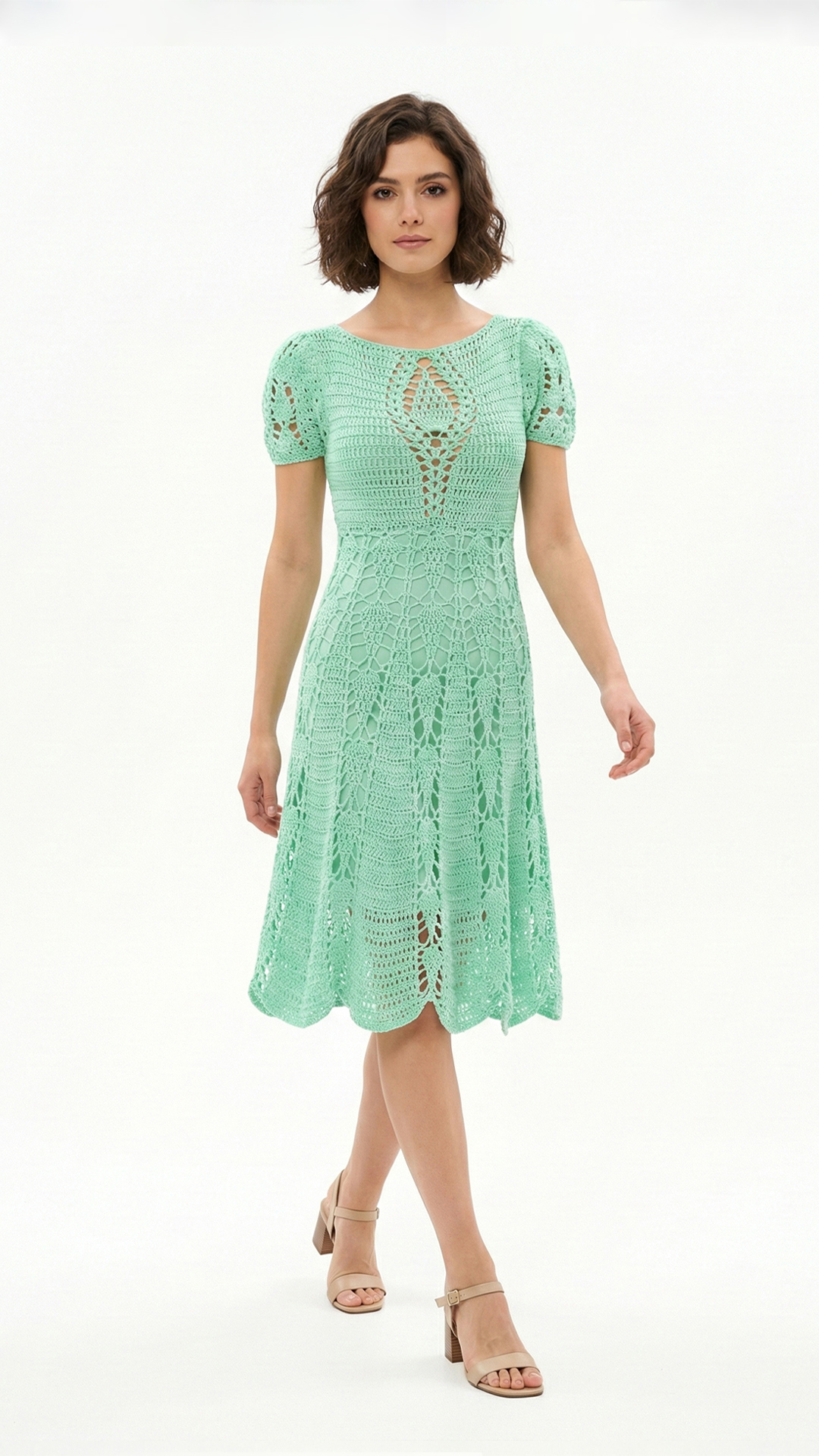 Vestido de crochê, confeccionado em fio 100% algodão mercerizado na cor Verde-claro. O comprimento é midi, com mangas curtas levemente bufantes. O decote é canoa e a saia rodada. Possui um forro de malha fixo com transparência na parte inferior e cordão ajustável abaixo do busto.